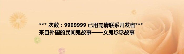 本文*** 次数:9999999 已用完请联系开发者*** 来自外国的民间鬼故事——女鬼珍珍故事到此分享完毕,希望对大家有所帮助。