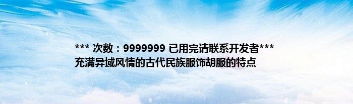 本文*** 次数:9999999 已用完请联系开发者*** 充满异域风情的古代民族服饰胡服的特点到此分享完毕,希望对大家有所帮助。