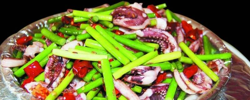 鱿鱼须炒熟后倒入蒜苔,大火翻炒。
