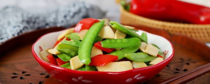 4、放入荷兰豆和红椒,将红椒翻炒断生,放入盐、糖和酱油,翻炒均匀即可出锅。