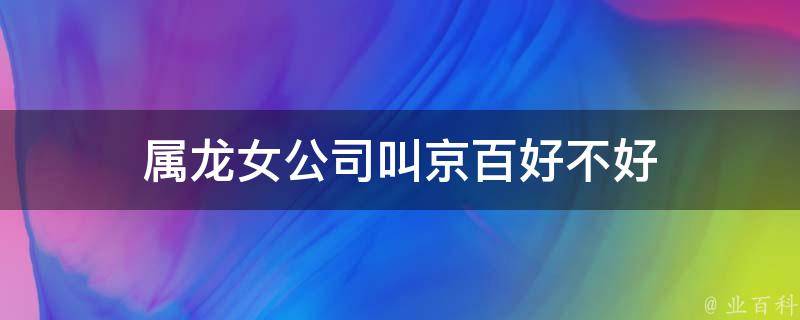 属龙女公司叫京百好。属龙的女性一般都非常自信、有领导能力和有冒险精神,而京百这个名字也给人一种大气、高端、有品质的感觉,很符合属龙女的气质和形象。同时,京百这个名字也很容易让人联想到中国的传统文化和历史,有一种文化底蕴很深的感觉,也很符合属龙女的文化背景。最终是否适合属龙女还要看个人喜好和公司的具体情况,比如公司的定位、业务、目标客户等。