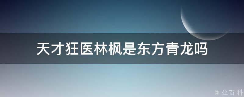 最佳答案天才狂医林枫不是东方青龙,只是一个医术超群的医生。《天才狂医》是一部完结的都市类轻小说,作者是陆尘。内容简介:林枫,出身古老的中医世家。秉承祖训下山历练,为了习练祖上医术而躲避上京三大美女的逼婚,他一路躲藏,最终在比较落后的周山省西前市第一人民医院安身立命。