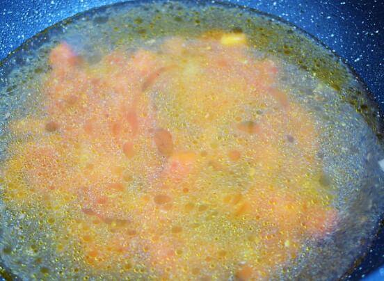 3、放入番茄翻炒至出汁。加入800毫升的水。