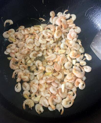 5、锅里油烧热,放入虾、生姜、大蒜下锅爆炒,放点水,以防糊沾锅。