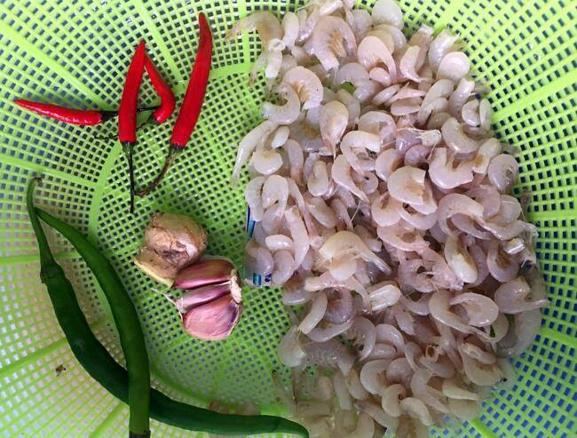 3、虾剪好后洗净,准备大蒜、生姜、辣椒。