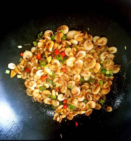 2、把虾,小茴香,大葱放进去翻炒,盖锅盖煮沸腾放一勺盐,给它翻一翻,虾变红出锅即可。