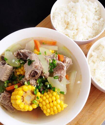 1、准备食材:排骨500g、冬瓜500g、玉米、胡萝卜、姜、小葱、料酒、盐、花椒、茴香。
