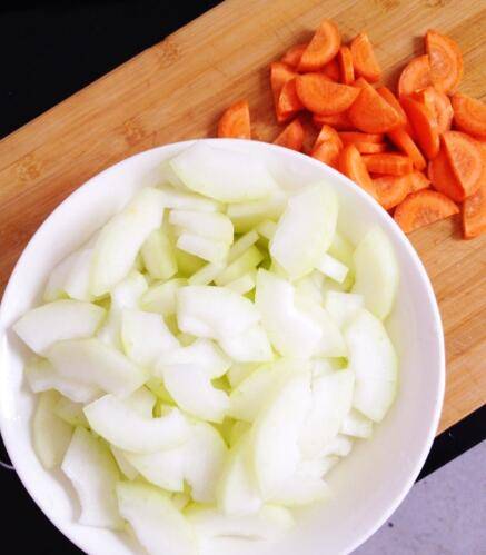 3、冬瓜去皮切片,胡萝卜切片,备用。