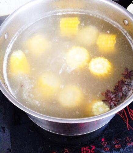 4、准备工作就绪,我们开始吧,锅中加入适量清水,烧开后放入排骨和玉米,加入花椒大料粒,姜片,适量料酒。小火炖一个小时。水量要一次加足,中途不要加冷水,影响口感。我准备的是生的玉米,所以和排骨一起炖,如果是煮熟的玉米,可以等排骨快熟的时候再加。