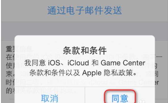 11、此时会弹出Apple的协议和条款的确认窗口,也没多大用处,直接点击右下角“同意”即可,如图所示。
