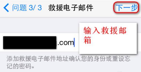 9、当设置好三个密保问题之后会要求输入一个救援电子邮箱,其作用也和上面的三个密保问题一样,用于防治忘记Apple ID的密码,因此需要记住自己输入的救援电子邮箱,如图所示。备注:救援电子邮箱必须是有效可用的。