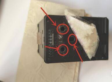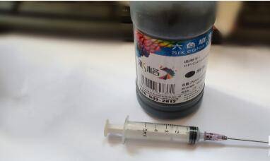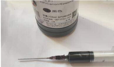 把注射器针头插入墨盒顶端的小孔中,缓慢推动注射器注入墨水,把标签重新粘紧即可。