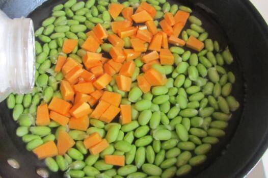烧锅开水,加入点盐,将毛豆米和南瓜丁放入里面焯煮至九成熟。