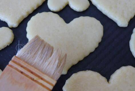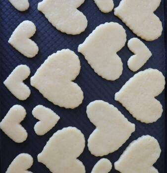 5、准备上下两张油纸,将面团放在中心,擀成1cm厚的面片,用模具压出饼干形状,多余的面团再次揉在一起,擀薄、压出花形。
