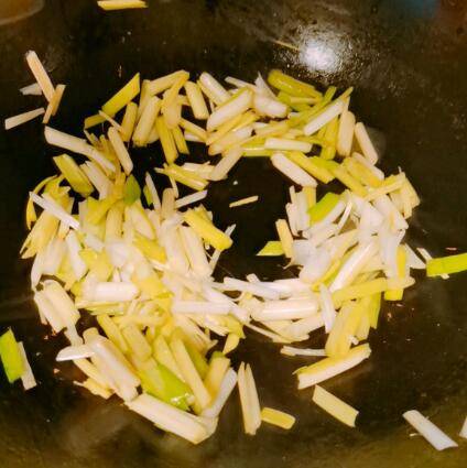 5、再倒油,下蒜叶炒香。