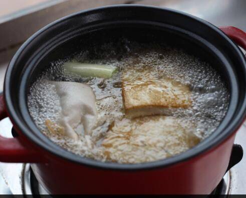 北豆腐一块、花椒适量、大料适量、香叶适量、葱一段、冰糖适量、盐两小勺、酱油适量、蚝油适量、蒸鱼豉油适量。