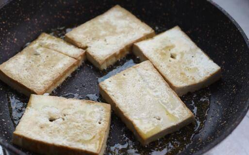 北豆腐切片备用,平底锅中放少许油,将豆腐煎至两面金黄。