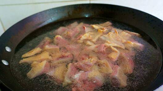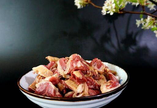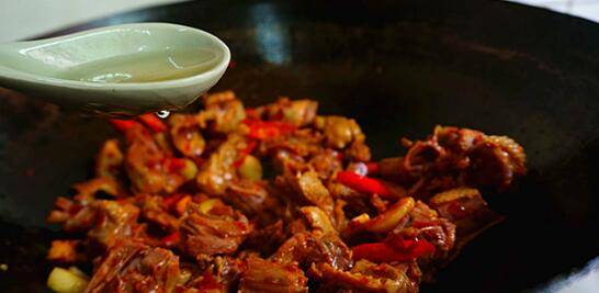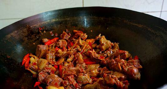 10、加入沥干水的腊鸭块翻炒三四分钟左右,至鸭块出少许油。