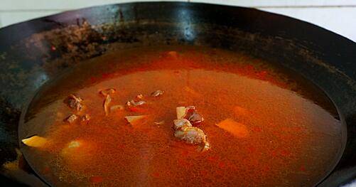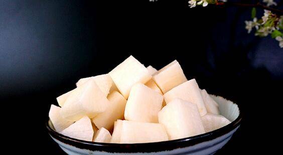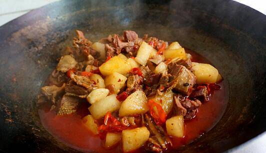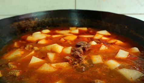 13、汤汁还剩三分之二的时候,放入萝卜块翻炒匀一起煮。