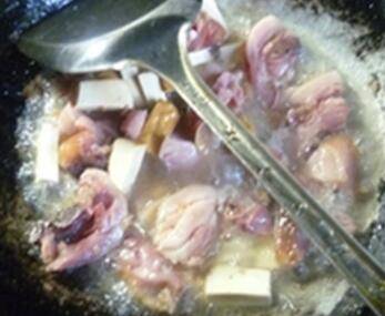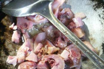2、烧锅倒油烧热,下入剁好的腊鸡腿翻炒均匀。