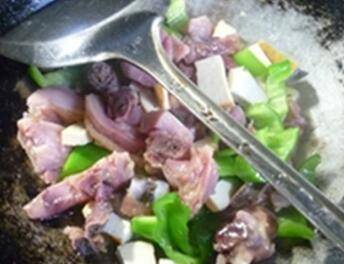 4、倒入青椒段,加适量的鸡精调味,翻炒均匀即可出锅。