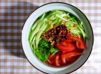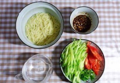 2、将黄瓜切丝、西红柿切细片、蒜切碎、香菜切碎、炸辣椒油备用。