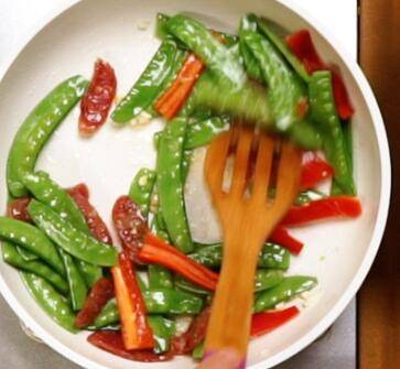 3、倒入腊肠、荷兰豆、清水,翻炒均匀。