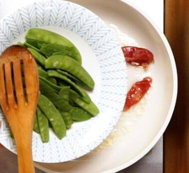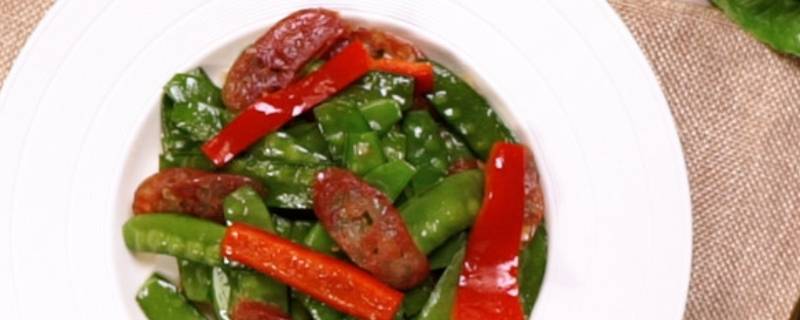 1、荷兰豆去蒂,腊肠切片,蒜切成末,红椒切段。