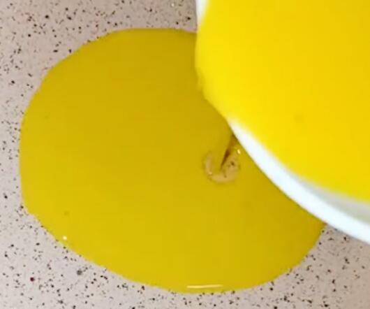 3、鸡蛋打入碗中,搅拌均匀,不粘锅刷油,倒入蛋液。