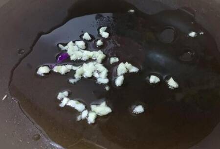 3、锅内倒油,油温升高后,放入蒜爆香。