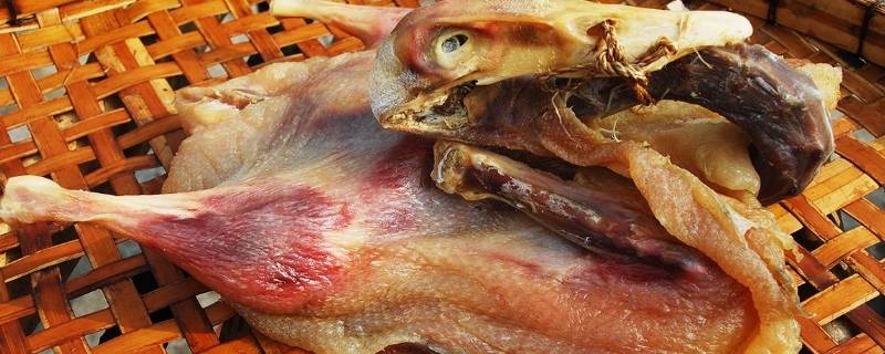 腌制腊鸭按照10比1的比例放盐,即一斤鸭肉需要1两的盐,盐不能多也不能少,太多盐会太咸,少了容易变质。腊鸭主要食材是屠宰过的鸭子,调料有盐、五香粉、二锅头,制作方法为鸭子腌制过后,采用日晒方式进行脱水,晒干即成。