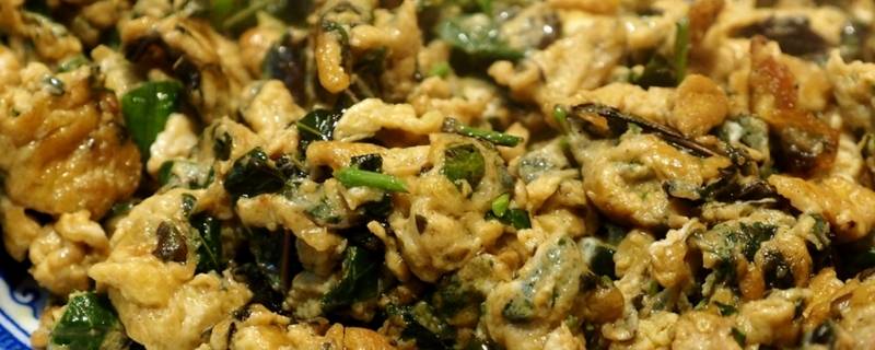 2、香椿芽洗净焯水过凉沥干,切碎,调入鸡蛋液,加盐调匀。