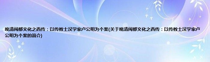1、 《晚清闽都文化之西传:以传教士汉学家卢公明为个案》是2010年海洋出版社出版的图书。