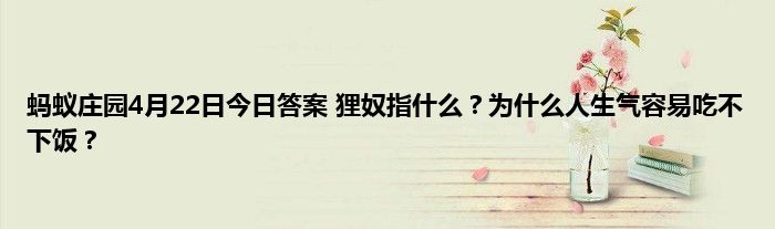 2021年4月20日蚂蚁庄园答案是什么?4月22日蚂蚁庄园的答案很多的玩家都不清晰,这两个问题有:陆游有诗云“溪柴火软蛮毡暖,我与狸奴不出门”,“狸奴”指?为什么人生气容易吃不下饭?下面小编给大家介绍一下具体的答案和解析,一起来看看吧。