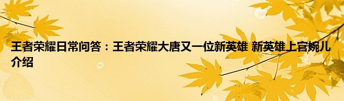 小编今天给各位玩家朋友们带来的是王者荣耀日常问答:王者荣耀大唐又一位新英雄,新英雄上官婉儿介绍,有记得的玩家朋友吗?不记得也没有关系,小编已经帮助大家把王者荣耀日常问答:王者荣耀大唐又一位新英雄,新英雄上官婉儿介绍找了出来,你只需要动动你的小手就可以轻松知道啦,快来瞧一瞧吧。