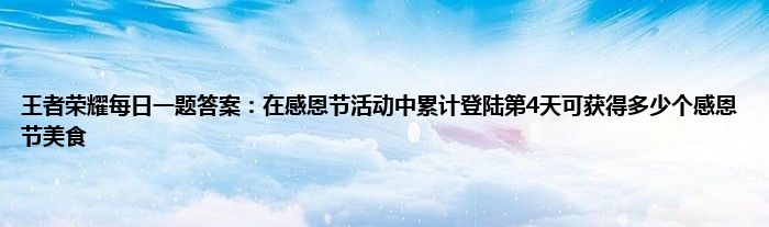 今天来聊聊关于王者荣耀每日一题答案:在感恩节活动中累计登陆第4天可获得多少个感恩节美食的文章,游戏是很多人的选择,但是游戏玩多了也会身心疲惫,现在就为大家来简单介绍下王者荣耀每日一题答案:在感恩节活动中累计登陆第4天可获得多少个感恩节美食,希望对各位小伙伴们有所帮助。