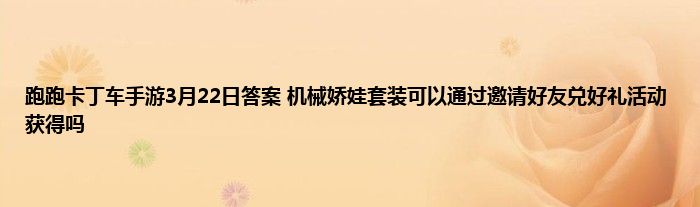 跑跑卡丁车手游在超跑会微信号上每天都会提出一个问题, 只要回答正确就可以获得丰厚的奖励,3月22日官方所提出的问题是:机械娇娃套装可以通过邀请好友兑好礼活动获得吗?相信一定有很多玩家都不知道答案吧,那就由小编来告诉你超跑会3月22每日一题答案。